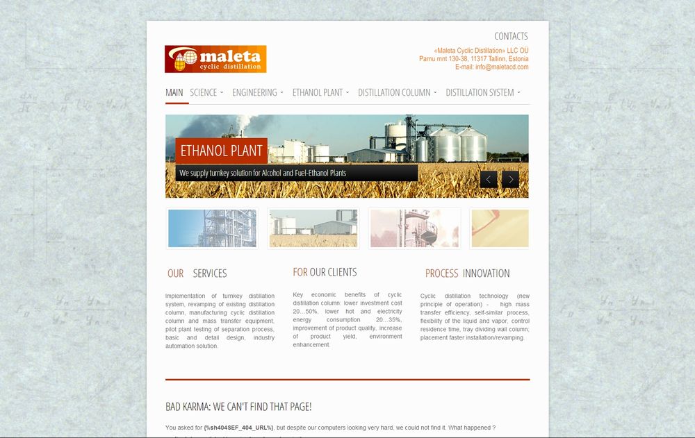 Производственные, технологические линииMaletaCD. Массообменные колонные аппаратыУкраина - КиевСайт компании Малета, которая занимается исследованиями, разработкой и производством ректификационных колонн (массообменных колонных аппаратов). Предлагаем следующие виды брагоректификационных (ректификационных) установок: бражная колонна, спиртовая колонна, эпюрационная колонна, колонна окончательной очистки, колонна концентрации примесей. Инновационные научные разработки массообменных контактных устройств защищены патентами Украины и Российской Федерации. Использование инновационных ректификационных колонных аппаратов в промышленности позволит снизить капитальные и энергетические затраты, увеличить выход продукции и улучшить ее качество. Это доказано реализованными ЧП Малета проэктами.